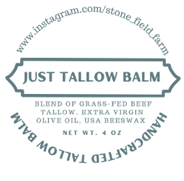 All Purpose Tallow Balm. This is a solid lotion, or a dry skin soother, it works wonders on heels, yet gentle enough for baby bottoms! I use it as my moisturizer now, and on diaper rash. My son likes it on scrapes. For $15 you can snag this cute little 4oz jar and be ready for anything. Blend of Stone Field Farm grass-fed tallow, extra virgin olive oil and USA Beeswax.