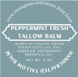 All Purpose Tallow Balm. This is a solid lotion, or a dry skin soother, it works wonders on heels, yet gentle enough for baby bottoms! I use it as my moisturizer now, and on diaper rash. My son likes it on scrapes. For $15 you can snag this cute little 4oz jar and be ready for anything. Blend of Stone Field Farm grass-fed tallow, extra virgin olive oil, USA Beeswax, and Peppermint Essential Oil.